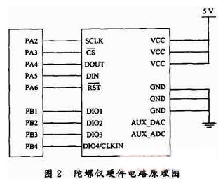 陀螺儀硬件電路原理圖如圖2所示,選用LM3S8962自帶的SPI硬件接口對ADIS16365進行操作,在電路設計中只需要直接將LM3S8962的SPI硬件I/O接口與ADIS16365相應的接口連接起來。