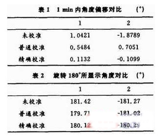 ADIS16365擁有較為完善的數據處理方案,經測試,使用其內部校正功能可以明顯改善系統性能。根據寫入GLOB_CMD寄存器命令的不同,可以采用不同的處理方法。表1和表2列出了內部普通校準和精確校準與未校準數據的比較。