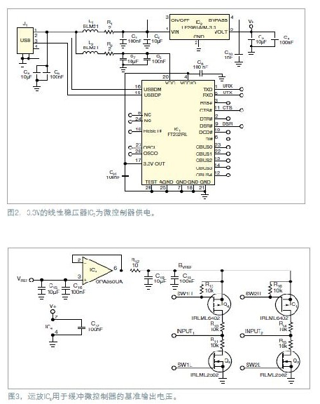 3.3V的線性穩(wěn)壓器IC2為微控制器供電(圖2)。從USB端口通過磁珠與濾波器,就可以直接為USB芯片IC1供電。這款芯片是常見而可靠的USBUART芯片,可與使用任何操作系統(tǒng)的計算機(jī)通信。運(yùn)放IC4用作微控制器基準(zhǔn)輸出的緩沖(圖3)。