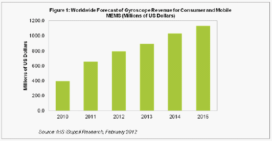 據(jù)IHS iSuppli公司的MEMS市場追蹤報告,由于蘋果iPhone和iPad去年第四季度創(chuàng)出最高銷量紀(jì)錄,2011年陀螺儀成為消費與移動MEMS領(lǐng)域中的創(chuàng)收大戶。