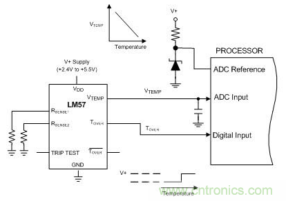 處理器的模數(shù)轉(zhuǎn)換器用于采集溫度模擬電壓(VTEMP)。當(dāng)溫度超出臨界值時(shí),過(guò)熱(TOVER)輸出端會(huì)驅(qū)動(dòng)處理器的輸入端進(jìn)行指示。跳脫點(diǎn)由兩個(gè)無(wú)源電阻器(RSENSE1和RSENSE2)設(shè)置,而不是由有效參考端和偏壓電阻器設(shè)置。
