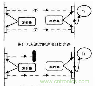 本設計的改進之處是設計一個具有計數功能的模塊,我們可以使用對射型光電傳感器,如圖1所示在洗手間的進口處設置兩個發射源和兩個接收源,當有人進或者出洗手問的門時,會阻擋光線,如圖2所示,接收處就接收不到設置光源發出的光信號,這時接收處的輸出端會發出一個信號,計數器就可以通過此信號進行計數。只要計數器里存儲數等于一時,系統控制燈亮,大于零時,該系統就會控制燈一直亮著,一旦為零,系統會控制燈延時一小段時間后自動熄滅。由于整個系統初啟動時無法判斷室內是否有人,因而我們還會設置一個簡易開關,供使用者進行手控,且為方便使用者能在夜間看到開關的位置,我們可以采用表面具有夜光性能的材料來做按鍵。光電檢測系統的啟動由光敏傳感器控制。