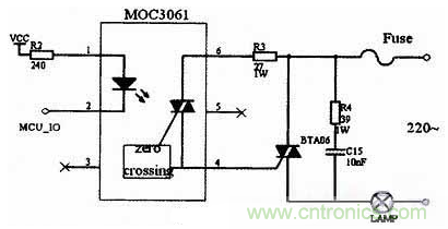 本系統由光電傳感器檢測洗手間內是否有人,單片機進行計數,當N不為零時,單片機會向與MOC3061芯片引腳相連的端口輸送信號,然后通過可控硅來控制燈的開、關。其中R3是雙向可控硅的門極電阻,當可控硅靈敏度較高時,門極阻抗也很高,并上R3可提高抗干擾能力。 39Ω電阻和0.01μF電容組成浪涌吸收電路,防止浪涌電壓損壞雙向可控硅。其電路圖如圖4所示。