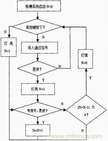 系統流程圖如圖5所示。其中N表示洗手間內現有的人數,當檢測系統電源連上后,光電傳感器開始檢測,但系統不知道洗手間內此時是否有人,默認是無人,因而燈是不會亮的,這時按鍵可以用來對系統進行調整。當光強增大到一定值時,檢測系統自動停止工作。