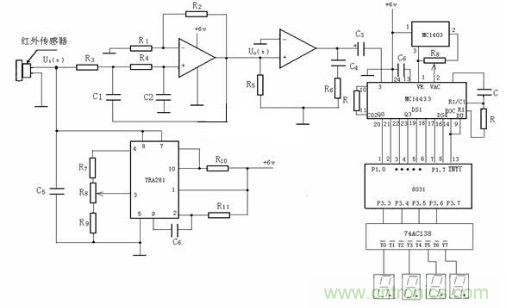 按照上述設(shè)計(jì)原理,設(shè)計(jì)的二氧化碳檢測電路如圖3所示。工作原理是首先由紅外傳感器將探測到二氧化碳?xì)怏w的濃度并轉(zhuǎn)換成電信號,濾波電路提取電信號并輸出到放大電路,經(jīng)過單片機(jī)系統(tǒng)處理后輸出,再由74AC138送入顯示電路,以實(shí)現(xiàn)對二氧化碳?xì)怏w濃度的檢測。