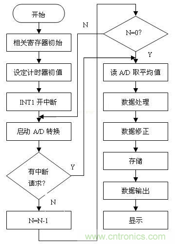 檢測處理程序流程框圖如圖4所示。采用MCS系列匯編語言〔5〕編程,由于有硬件設(shè)計(jì)的保證,使得整個系統(tǒng)既可以工作在循環(huán)查詢的方式,也可工作在中斷管理的方式。