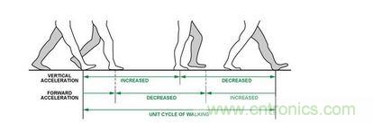反映到圖表中,可以看到,在步行運動中,垂直和前進產生的加速度與時間大致為一個正弦曲線,而且在某點有一個峰值。其中,垂直方向的加速度變化最大,通過對軌跡的峰值進行檢測計算和加速度閥值決策,即可實時計算用戶運動的步數,還可依此進一步估算用戶步行距離。