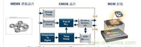 MEMS硅晶振由于采用全自動化的半導(dǎo)體工藝,內(nèi)部兩個晶片(一個是MEMS諧振晶片、一個是具有溫補(bǔ)功能的鎖相環(huán)CMOS電路)采用MCM封裝在一起。