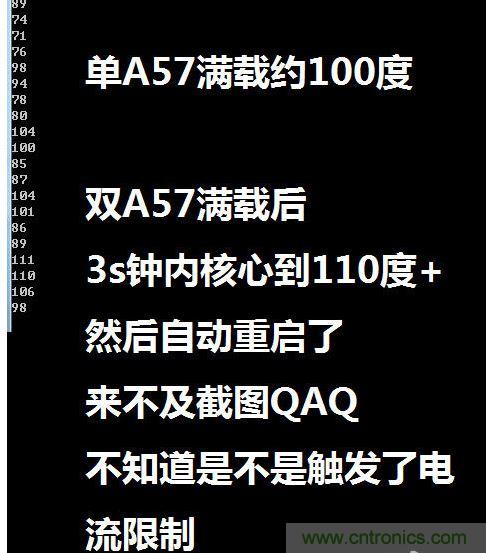 那么810的功耗有多高呢,根據(jù)貼吧大神(炮神)ioncannon的分析,在Z9 Max上,810的單核心功耗最高可以達(dá)到5W(注意是單核心!單核心!單核心! 重要的事情要說三遍),雙核A57同時(shí)滿載3S就發(fā)熱達(dá)到110攝氏度,并自動重啟了,想測試下雙核的功耗都以為爆機(jī)沒辦法測試了。