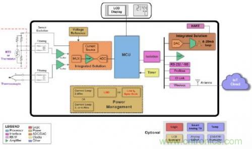 圖 1 是現場變送器的方框圖,其采用一個電阻式溫度檢測器 (RTD)、熱敏電阻或熱電偶來測量主要的變量。