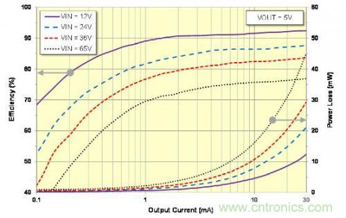 LM5165 中內置的面向智能傳感器應用的各種特性包括一種用于實現最佳解決方案尺寸的簡單控制架構、用于提供低壓差的 100% 占空比能力、一個用于電源軌排序和故障報告的漏極開路電源良好指示電路、在內部固定或從外部可調的軟起動 (SS)、以及具有可定制遲滯以提供可編程線路欠壓閉鎖 (UVLO) 功能的高精度啟用。而且,一種可調的逐周期電流限制優化了電感器選擇和尺寸。圖 3 顯示出了對于 0.1mA 至 30mA 負載電流的轉換器效率和功率耗散。