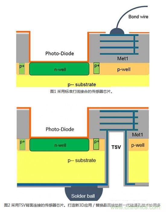 模擬3DIC技術(shù)通常是透過(guò)建造芯片正面到IC背面的電氣連接來(lái)實(shí)現(xiàn)傳感器應(yīng)用。 在許多傳感器應(yīng)用,例如光學(xué)、化學(xué)、氣體或壓力傳感器中,感測(cè)區(qū)域是位在CMOS側(cè)(晶圓的頂端)。 芯片和導(dǎo)線架之間最常用的連接是打線接合(Wire bonding)(圖1)。 無(wú)論是使用塑料封裝,或是將裸片直接接合在印刷電路(PCB)或軟性電路板上,對(duì)于某些會(huì)將感測(cè)區(qū)域暴露出來(lái)的應(yīng)用而言,打線接合并非理想的解決方案。 采用專業(yè)晶圓代工業(yè)者的專有TSV技術(shù),可以利用TSV、背面RDL和芯片級(jí)封裝(WLCSP)(圖2)來(lái)替代打線。
