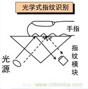 光學傳感器的發展歷史可能是最久的了,已經有30年的歷史了。實現的原理也是最簡單的。 它主要是利用光的折攝和反射原理,將手指放在光學鏡片上,手指在內置光源照射下,光從底部射向三棱鏡,并經棱鏡射出,射出的光線在手指表面指紋凹凸不平的線紋上折射的角度及反射回去的光線明暗就會不一樣。用棱鏡將其投射在電荷耦合器件上CMOS或者CCD上,進而形成脊線(指紋圖像中具有一定寬度和走向的紋線)呈黑色、谷線(紋線之間的凹陷部分)呈白色的數字化的、可被指紋設備算法處理的多灰度指紋圖像。
