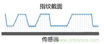 其原理是將電容感整合于一塊芯片中,當指紋按壓芯片表面時,內部電容感測器會根據指紋波峰與波谷而產生的電荷差,從而形成指紋影像。如下簡圖,可以把上面的凹凸認為是指紋的谷和脊,那么同傳感器就會形成不同的電容差,這樣傳感器就可以根據這些不同的電容差畫出指紋的紋理。