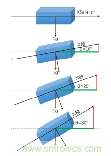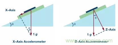 如下圖,坡度角θ。下圖左邊,檢測軸X軸垂直于重力平面(坡度為0時(shí)),此時(shí)加速度傳感器的輸出Ax=sin(θ)*1g。下圖右邊,檢測軸Z軸平行于重力平面(坡度為0時(shí)),此時(shí)加速度傳感器的輸出Az=cos(θ)*1g。