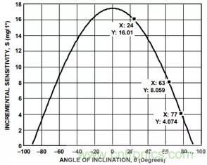 為了滿足應(yīng)用在整個(gè)傾斜角檢測范圍內(nèi)分辨率的要求,可以利用上圖的曲線來確定系統(tǒng)的最小靈敏度。假設(shè)應(yīng)用要求最小分辨率為1°,傾斜角檢測范圍在-63°到+63°之間。根據(jù)上圖, 增量靈敏度在傾斜角0°到90°變化時(shí), 逐漸變小,當(dāng)?shù)竭_(dá)63°時(shí),靈敏度降至4.074mg/1°。