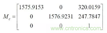 其中:(u,v)是特征點的圖像坐標,(u0,v0) 光軸中心的圖像坐標,(kx ky )是X 軸,Y 軸方向的放大系數(shù),(xc yc zc) 是特征點在攝像機坐標系下坐標, Mc 是攝像機內參數(shù)矩陣。