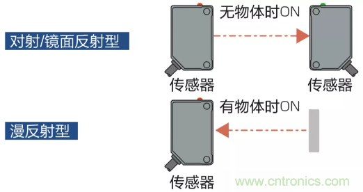 對射型/鏡反射型傳感器無物體時為ON;漫反射型傳感器有物體時為ON